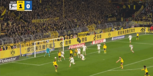 第43分钟,打破僵局,扬-科托助攻布兰特破门,多特1-0霍芬海姆