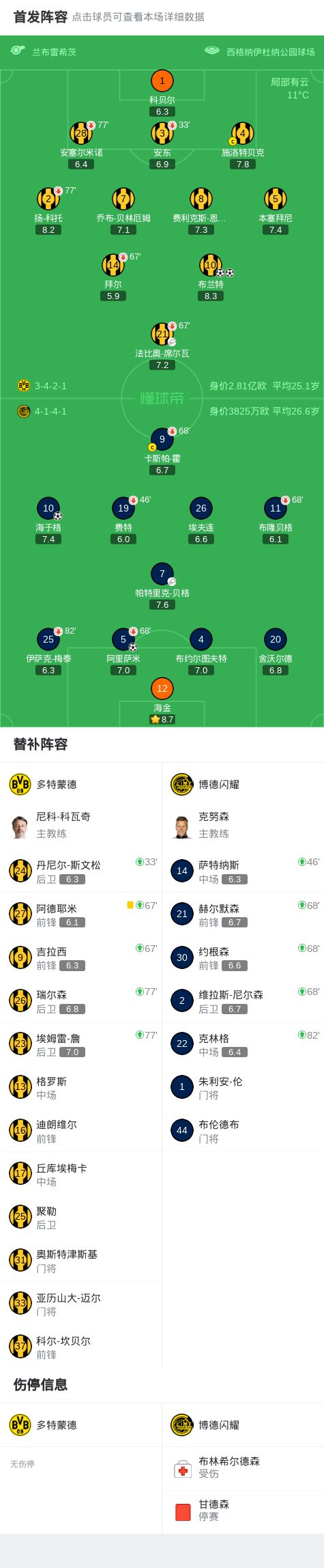 多特蒙德2-2博德闪耀,布兰特双响,阿里萨米、海于格建功